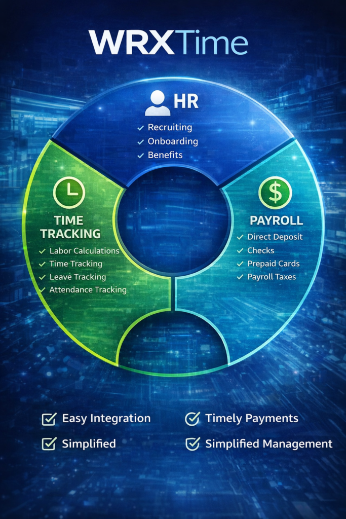 Time Tracking • PTO Accruals • Leave Policies • Attendance Insights WRXTime™ captures employee hours, automates PTO tracking, manages leave policies, and provides workforce insights. Fully integrated with WRXHR™ and WRXPay™.